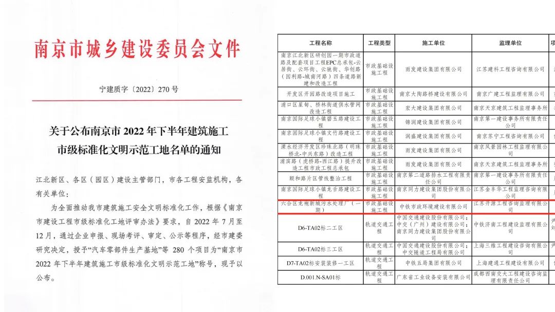 近日,南京市城鄉(xiāng)建設(shè)委員會發(fā)布了《關(guān)于公示南京市2022年下半年建筑施工市級標(biāo)準(zhǔn)化文明示范工地名單的通知》,公司承建的南京市六合區(qū)龍袍新城污水廠(一期)榮獲南京市2022年下半年建筑施工市級標(biāo)準(zhǔn)化文明示范工地。...